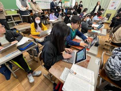 国語科では、「メディアと人間社会」「大切な人と深くつながるために」「プログラミングで未来を創る」の3つの説明的文章を読み、これからの社会を生きていくために大切なことをそれぞれが考えていきます。1月26日(金)の6時間目には、1組が1時間目の学習に入りました。他の学校からも教員の参観者がいる中で、子どもたちは一生懸命集中して学習に取り組んでいました。