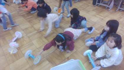 昨日、図工の「かみざらコロコロ」の学習のまとめとして、友だちの作品を鑑賞した後、みんなで「コロコロレース」をしました。デザイン重視の子どもたちも一生懸命転がしていて、とても楽しかったです。またお家でもコロコロしてみてください。(コロコロしない場合は観賞用ですので、大切にお飾りください。)