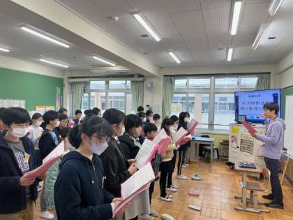 ソプラノパート、アルトパートに分かれて、卒業式の歌の練習を始めました。まずは音程をとるところから。部分ごとに主旋律を歌うパートが異なるので、自分のパートを捉えることがまず第一課題です。何度も聞き、何度も口ずさむことで少しずつメロディーが頭の中に入っていくようでした。