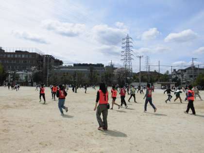 これは休み時間の運動場の様子です。先生も子ども達も関係なく元気よく遊んでいる様子が見られました。
