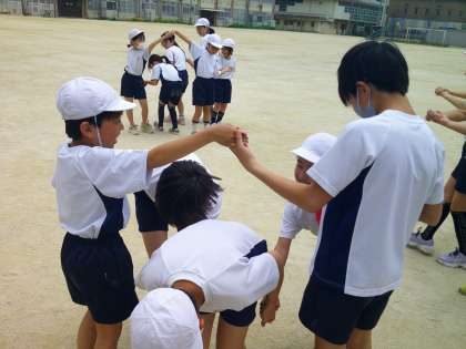 体育の様子です。着替える場所を確認した後、運動場で体ほぐし運動をしました。