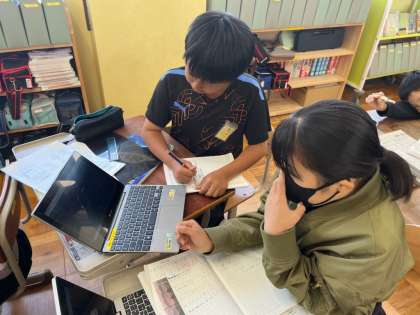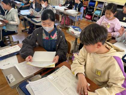 国語科「春の空」では、清少納言が感じた春のよさをみんなで味わいました。そして、自分が感じる春について、清少納言と同じように文章に表しました。自分で考えて作ったあとは、友達と推敲し合い、よりよい表現にしたり、より自分の感じたことが伝わる表現にしたりすることができました。