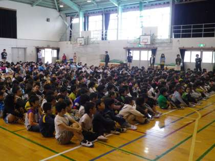 毎月一回月曜日の朝、「ともだちの日」が設定されています。今年度最初の今日は、一年間ともだちの日でどのような学習をするのかを担当の先生から話されました。一人ひとりが大切にされるためには、どのように考え行動すればいいのか、私たちの周りの人たちと共に生きていくためにはどうすればいいのかを考える日であることを伝えました。その後、この前卒業していった六年生からのプレゼントを旧担任から現六年生の代表に渡しました。品物は「手作りのぞうきん」です。卒業生からは「学校をもっともっと美しくしてください」というメッセージも映像で映されました。