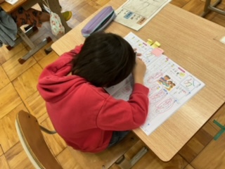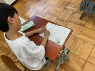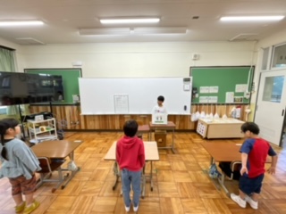 写真は日直の挨拶の様子です。1日の流れを全体で確認しました。そのあと、漢字テスト、進出漢字の学習、カタカナ、手先の学習と各々の課題に取り組みました。