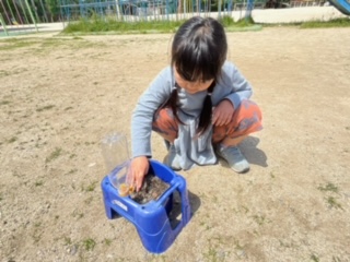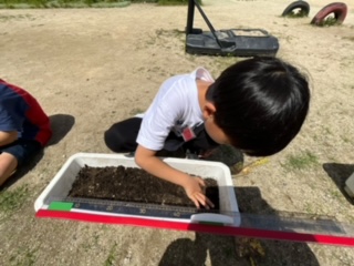 オクラの種をプランターに植えました。指で種を植えるところに窪みを作り、種を入れてから土を被せました。