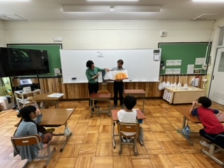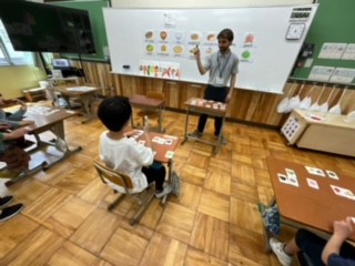 ザカリー先生と片山先生と一緒にレッツエンジョイ。「はらぺこあおむし」を英語で読んでくれたり、食べ物を英語で好きかどうか聞かれたり・・。こどもたちはとても楽しんでいる様子でした。