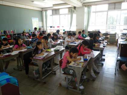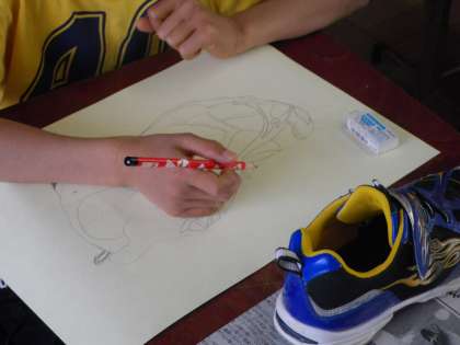 自分の運動靴を目の前におき,スケッチをしている4年1組の子どもたち。形や模様、ひもの様子などよく見て描いています。一人ひとり見方が違い、面白い形になっています。校長先生がはけるほどの大きさで描いている子どももいます。話し声もしない中で学習しています。黒板には「12時10分まで集中して」と書かれてありました。