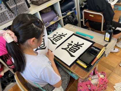 書写の学習では、毛筆で「道」と書きました。前回よりも、じっくりと手本を見て書く様子が見られました。しんにょうの部分は書き方が特に難しかったようですが、筆使いに気をつけて書くことができました。