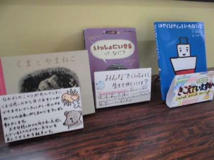 南校舎一階に設置してある「思いやりブックフェア」には、今月は高元先生、田村先生、溝口先生おすすめの三冊の本が紹介されています。6月はあじさい読書月間でもあります。校長先生、濱口先生のお話を思い出しながら、読書を通してお友達とのことを考えるのもいいですね。