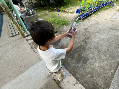 水鉄砲を作りました。ペットボトルに絵を描いて、ストローを通したら外へ。何度もペットボトルに水を入れては、水をとばして楽しんでいました。