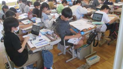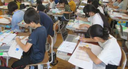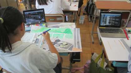 図画工作科では「私の大切な風景」という絵を描いています。6年間過ごしてきた小学校。その中で、自分の大切な場所だと思うところを選びました。表現を工夫しながら色を塗っています。