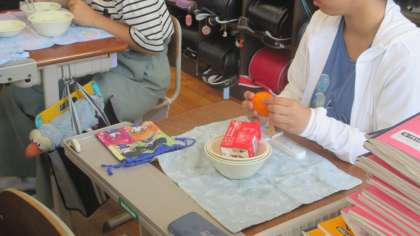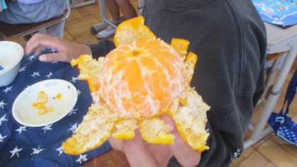 今年度初の「れいとうみかん」がでました!子ども達は嬉しそうにしていました。みかんについた氷で涼しさを感じていました。みかんを食べて、体温が少し下がり、気持ちよくなったそうです!