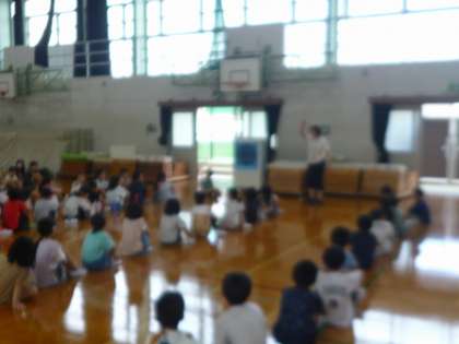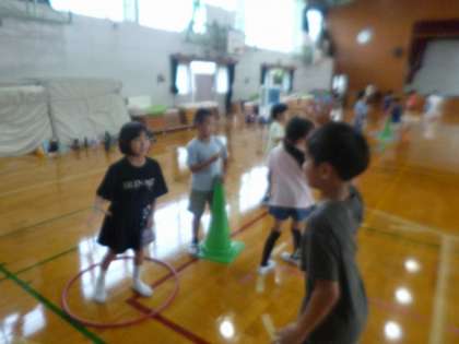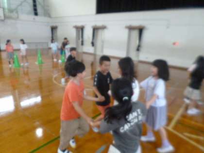 2年生みんなで体育館に集まり、夏休みの思い出を話したり、レクリエーションをしたりしました。レクリエーションでは、「UFO」をしました。宇宙人に捕まった友達を助けるために、グループで協力しながら楽しんでいました。