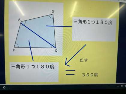 今日の算数科では、四角形の4つの角度の和がどれだけになるのか、三角形の学習を生かして考えました。分度器を使って角度を測ったり、一点に4つの角度を動かして考えたり、図に直線を引き三角形に分けて考えたり、いろいろな考え方をしました。自分の考えたことを友達にしっかり説明することで理解が深まり、練習問題にも前向きに取り組めました。