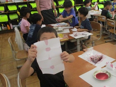 夏休みの間も、お家でしっかりお世話をして続けたアサガオ。株ごとの差はあれど、たくさんの花が咲いたようです。夏の間に、そんなアサガオの花を摘んで集めておいてもらいました。