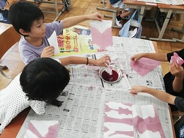 そのアサガオの花を持ち寄り、袋の中でもみもみ……。きれいなアサガオ色の色水が出来上がりました! せっかくなので、コーヒーフィルターや和紙をその色水で染めることにしました。