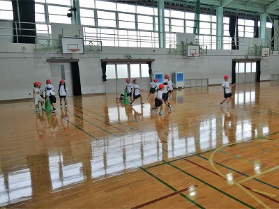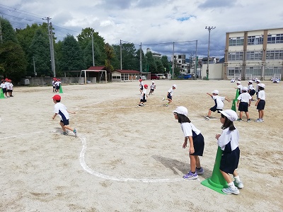 2学期初めの体育では「じんとりあそび」として、「どんじゃんけんぽん」の遊びをしました。