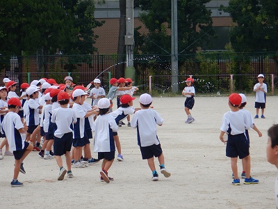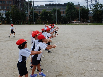 子どもたちに「夏と言えば、という遊び」を問いかけると、やはり暑い時期こそ気持ちのいい「みずあそび」という声がたくさん出てきました。そこで、小学校でも夏を感じる遊びをしようということで、マヨネーズの容器などを持ち寄って水遊びをしました。