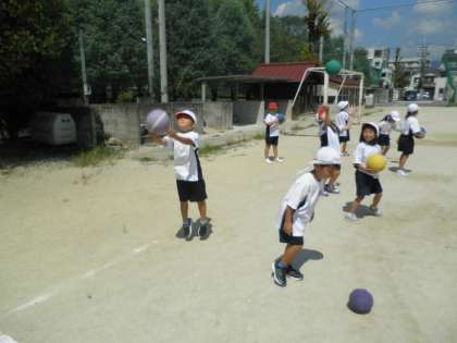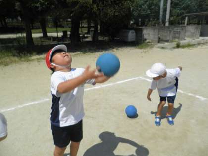 1年生は今、体育でボール遊びをしています。ボールを投げてキャッチするまでに、何回手を叩けるかや、くるっと1回転するなどの運動に取り組んでいます。「3回たたけたよ!」などと笑顔で報告してくれる子どもたちは、暑さなんて関係ないくらい元気です☆