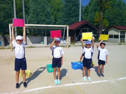 1・2・3・トンのリズムで走るインターバルを色で提示し、準備します。タイマーやスターターも自分たちでしました。目標は、50m走の自分のタイムです。