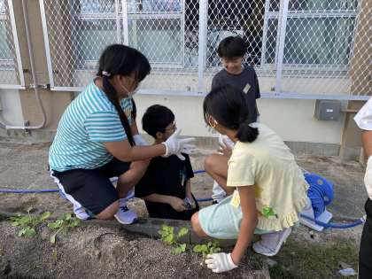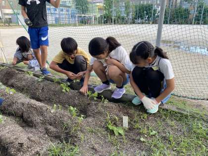 うねづくりを終えて種を植えた子どもたち。芽が生えてきたので、今日は間引きをしました。グループで1つの芽を決めて、それを大切に育てます。米と同様、水やりがとても大事です!自分がやる!と水やりの役割が取り合いになるくらい、積極的に取り組んでほしいと思います。