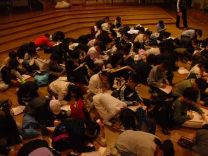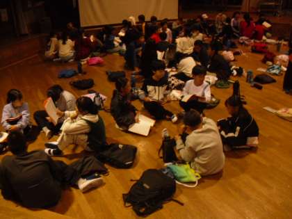 1日目の活動の最後は,ふり返りです。グループで今日の良かった点と課題点とを話し合い,明日につなげていきます。グループのあとは学年全体で発表しあいました。