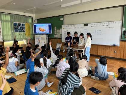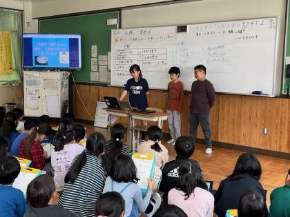 総合的な学習の時間に、米作りを行っている子どもたち。お米を育てている中や、農家方の話を聞かせていただいた中で、もっと知りたいなと思うことがたくさんありました。知りたいことをグループで分担して調べ、学年みんなで交流する時間をとりました。ロイロノートで発表資料を活用しながら調べたことを交流する中で、お米について新しい発見がたくさんありました。