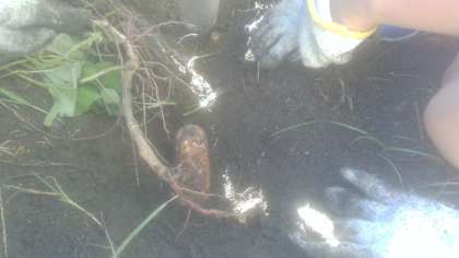 土の中を掘ると、ゴロゴロとたくさんのサツマイモができていました。