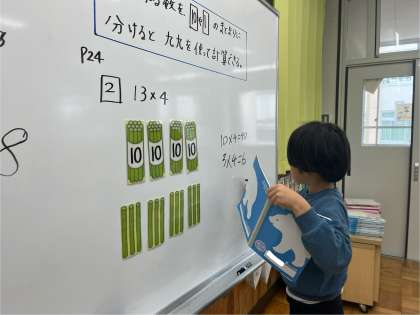 算数「1けたをかけるかけ算の筆算」の学習をしています。
