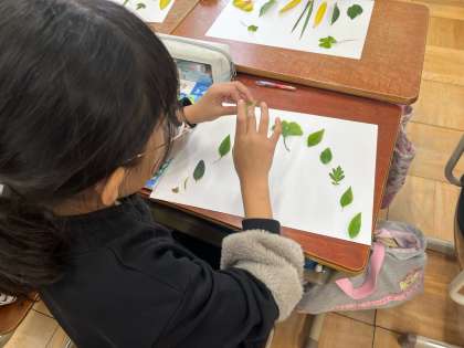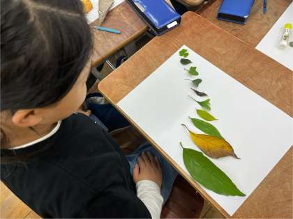 図工「お気に入りの葉」の学習で、自分が見つけた「お気に入りの葉」を画用紙に貼る学習をしました。小さい葉から大きい葉へと順に大きくなるように並べてみたり、アーチ型を描いてみたり…。とても個性豊かに仕上がりました。次回からは、葉に似た色を絵の具で作り出し、まわりに色を塗っていきます。