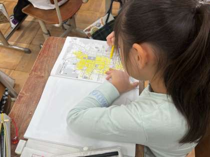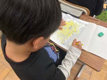 社会「京都市の様子とくらしのうつりかわり」では、京都市の市街地の様子や公共施設の数が時代によってどのように変わっていったのかについて、地図に色を塗りながら確かめていきました。黄色で塗った市街地が、時代が経つにつれて増えていっていることに気づいた子どもたちは「市街地が増えてるから、黄色を塗るのがつかれるよ!」と身をもって感じたようです。