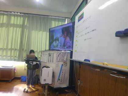 1組での発表の様子です。作ったエコ調理の工夫を紹介しました。