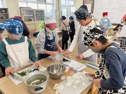 家庭科では調理実習をしました。あごでだしをとった味噌汁作りです。先週味わった、かつおや昆布のだしとくらべながら調理していきます。なかなか育たなかった大根。育ったグループは、自分たちで作った大根を具にして調理しました。