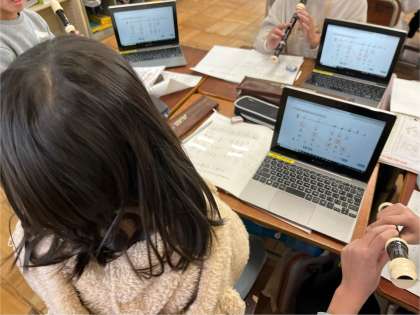 今日の音楽では、「ラ」「ド」「レ」の音を使って「せんりつづくり」を行いました。自分なりに旋律をつくった後は、グループの人たちと聴き合う活動を行いました。