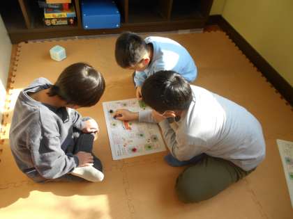 国語の時間にすごろくをしながら、文を読んだり、「あ」から始まる言葉をみんなで考えたりしました。順番やルールも確かめながらみんなで楽しむことができました。