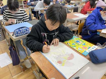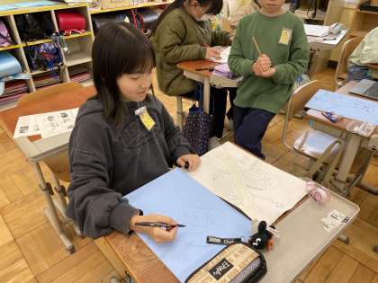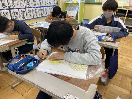 版画は、アイデアスケッチをカーボン紙を使って板に写す段階に入りました。ここに写した線を彫刻刀を使い分けて彫り進めていきます。いよいよ次回、自分が付けたい色ごとに彫る場所を確かめながら進めていきます。より集中力がいる作業です。しっかりと話を聞いて、間違えた場所を彫ってしまわないようにしましょう!