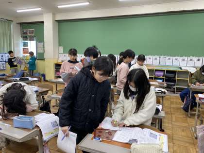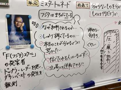 道徳の授業の様子です。伝記の学習をしたので、それにちなんだ題材のものを行いました。台風の強さを表す「Fスケール」のFは藤田さんの頭文字から来ているそうです。心理を探求したいと思う心は、周りからの批判も乗り越える強さを持ちます。みんなも周りと少し違うと不安に思ったり、それをしてもいいのかなと思ってしまう場面もあると思います。それを越えた先に見える世界がきっとあるはず!やってみたいな、チャレンジしてみたいな!そう思えるものがあったときは、どんどんやっていきましょう!