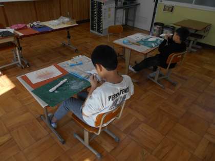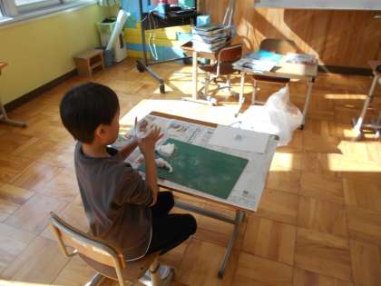 前の学習で描いた絵をもとに、水族館にいる生き物を作っています。今日は紙粘土で体を作りました。「クラゲの触手をどうするか」「サメの尾びれはどうするか」等、各々が考えながら作っていました。