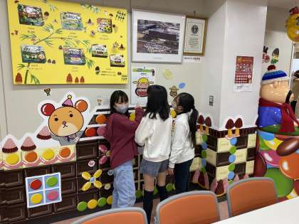 一通り工場で作られているお菓子について学習をした後、部屋に飾ってあるものからお菓子の歴史などを学びました。説明を聞いた後だったので、子どもたちは興味深々!1つ1つに見入っていました。この後、工場見学に向かいました。