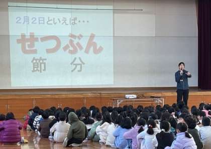 2月4日は2月の朝会がありました。校長先生からは「節分」のお話がありました。豆まきなど楽しい行事のお話のあとに、自分の心の中にいる鬼を外に出しみようというお話がありました。