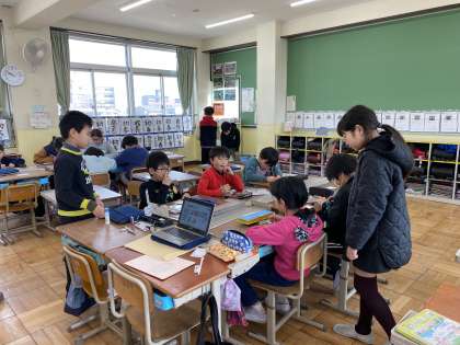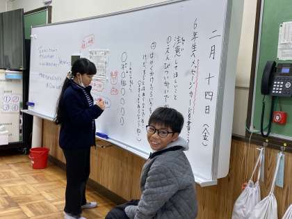 いよいよたてわり会議の当日になりました。ここまで準備したものをもって、それぞれの会議場所に向かっていきました。6年生がいない会議。5年生主体で進めました。カードの書き方など分からないところを優しく教える姿や分かりやすいようにホワイトボードに見本を書いている姿などがありました。