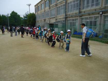 出発式では,係りの子どもが大きなハリのある声で出発の言葉を言い,みんなで見送りに来てくれた保護者の方に「いってきます」のあいさつをして出発しました。