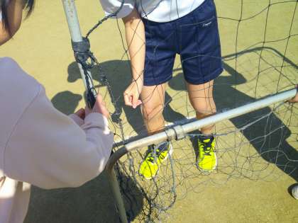 4年生の最後の体育はサッカーです。タグラグビーとチーム競技が続きます。1時間目は、ゴールの組み立てやパス、ドリブル、シュートの練習をしました。