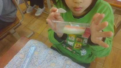 今日は「ひなまつり」の行事献立で、ちらしずしと三食ゼリーでした。数日前から三色ゼリーを楽しみにしていた子ども達は、目を輝かせながら食べていました。「何味だろう?」「メロン味かな?」などと楽しく話しながら、おいしい給食をいただきました。