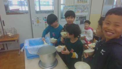 最近、ご飯のおかわりに列ができています。今日の献立は「おからそぼろどんぶりの具」だったので、ご飯に混ぜて食べようと思った子たちがたくさん集まりました。あっという間にご飯がなくなりました。