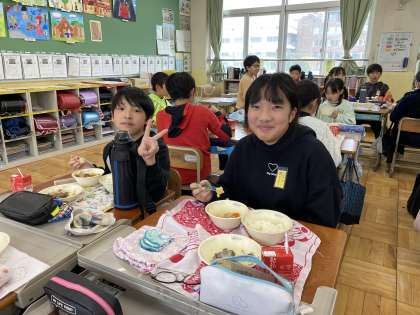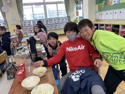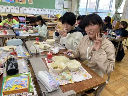 今日の献立「関東煮」にもたくさんのラッキーこんにゃく、ラッキーキャロットが入っていました!いつもよりもたくさんの人たちの器に入っていたので、子どもたちは大喜びでした。給食の時間に笑顔を届けてくれるひと工夫、いつもありがとうございます!
