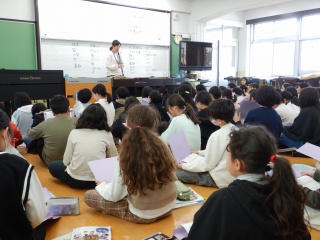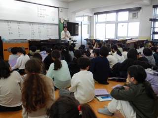 4時間目には学年全員で音楽室へ行き、音楽の授業のオリエンテーションを受けました。今年から、音楽専科の先生による授業がスタートします。初回の今回は、学習の進め方や心がけることなどを話してもらいました。
