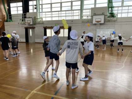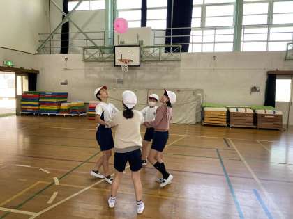 体育のオリエンテーションとして、体つくり運動をしました。自分の体がどのくらい動くのかを把握し、適切な運動を通して体づくりを進めていくことが大切です。写真は、柔軟をして、どこまで伸ばせるのかを確かめたのと、チームで力を合わせて風船をどれだけつなげるかを確かめている場面です。体は動かさないと固まっていくばかり。休み時間は元気に外に出て遊ぶ時間も作りましょう!