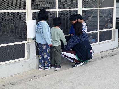 みんな生き物が大好きで、飼育小屋の前を通るたびに覗いています。今日は、危ない所探しの後、ゆっくり見ました。ここでも質問がたくさん出ていました。いろんなことに興味深々の子ども達です。