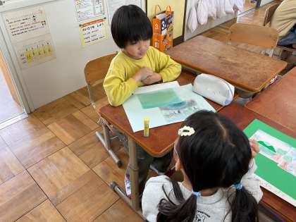 描いたものを友だちに紹介しました。表現方法も「どんな風に塗ったの」と聞いている人がいて、次の図工に活かそうとしている姿が素晴らしかったです☆